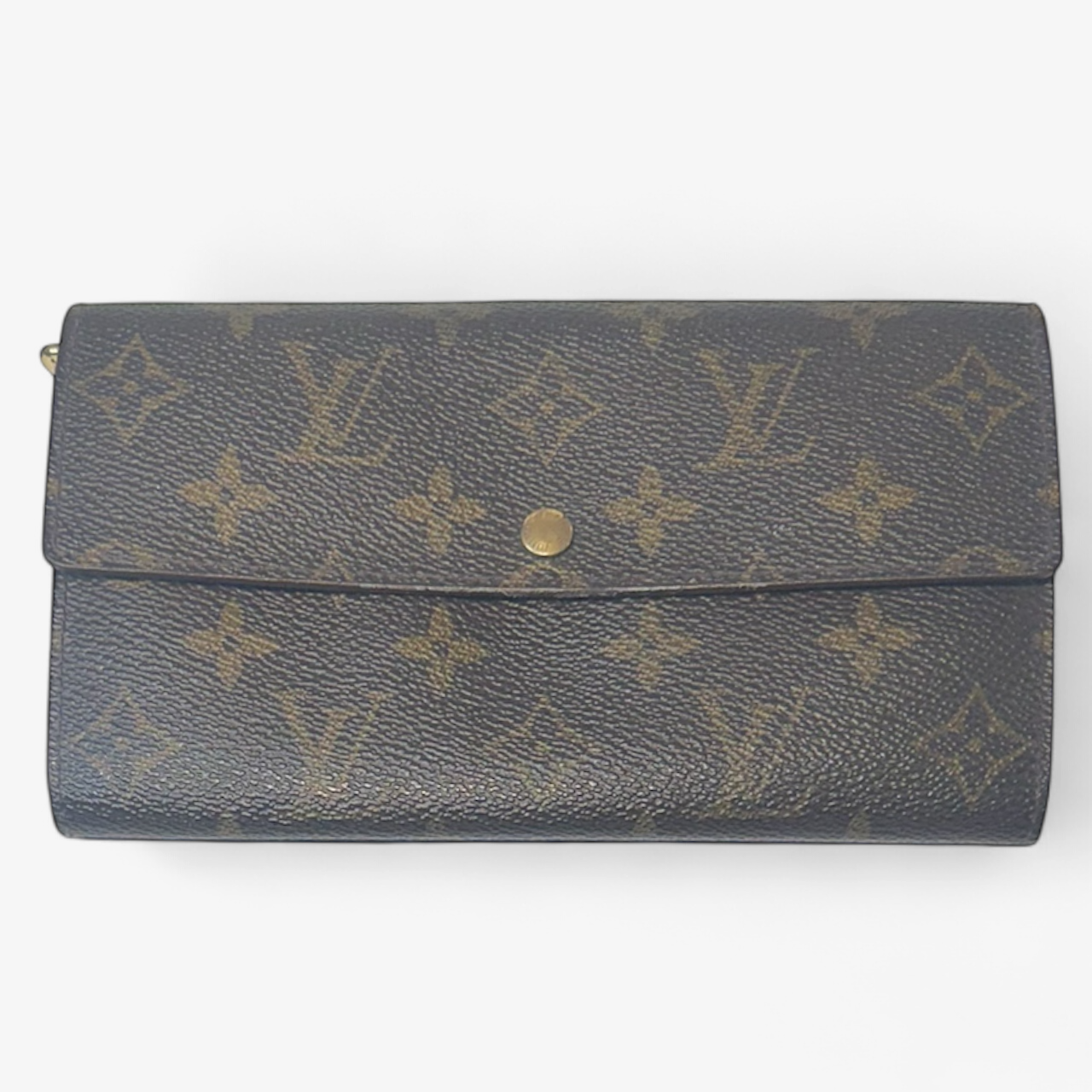 Description: Louis Vuitton Monogram printed wallet, in fair condition, featuring gold hardware, a button closure, internal compartments for organization, and a zippered closure.