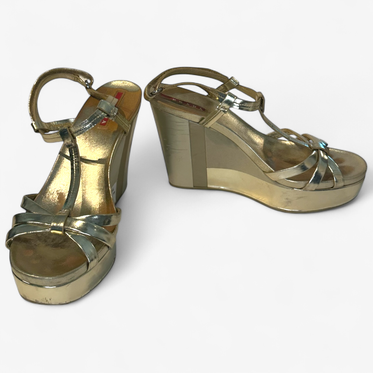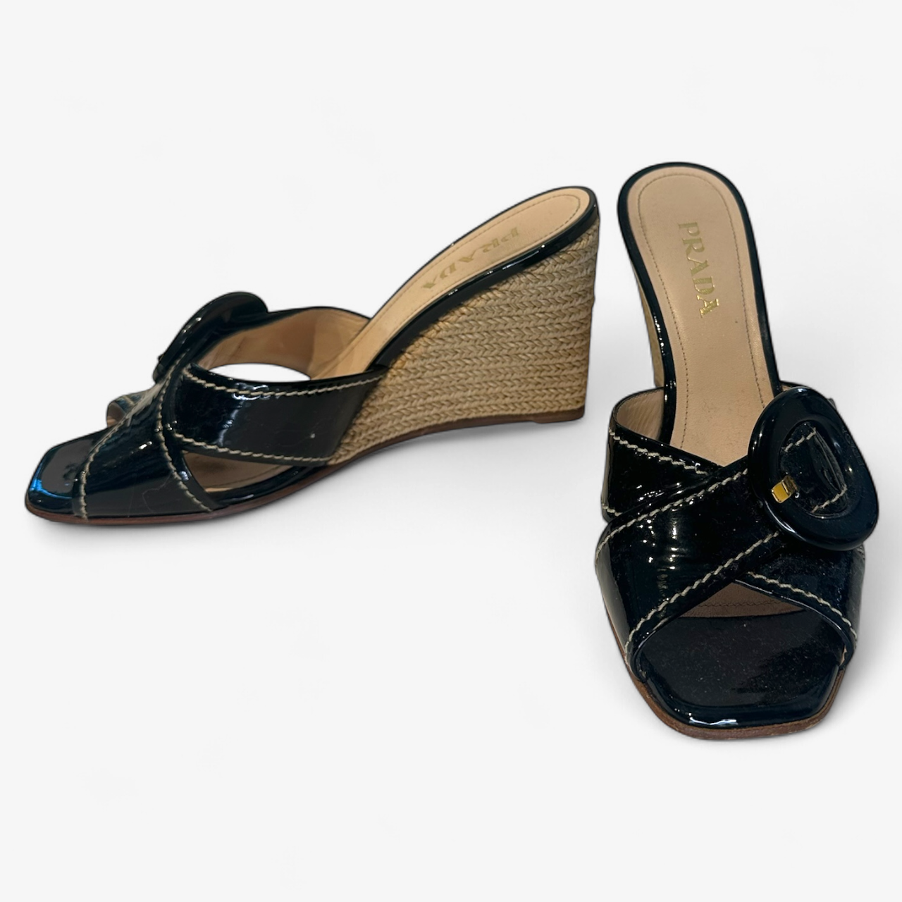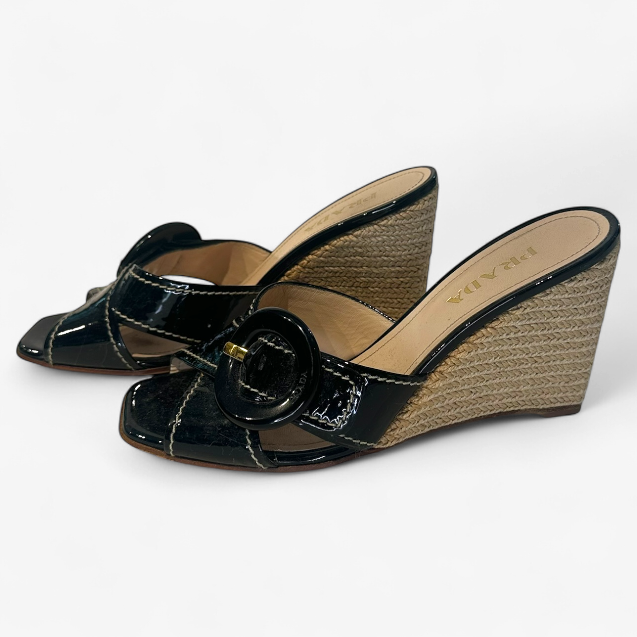 Prada Black Patent Leather Espadrille Wedge Sandals