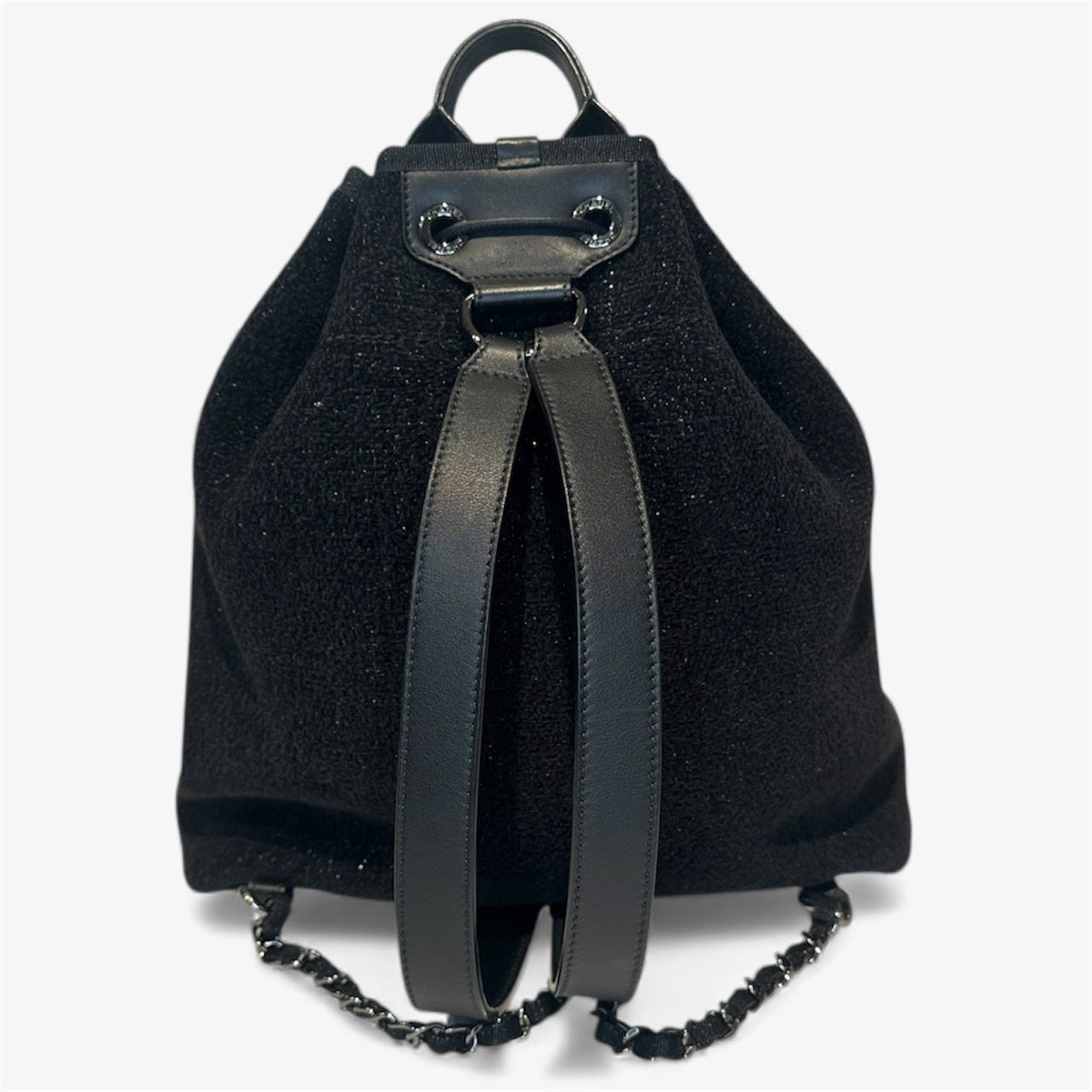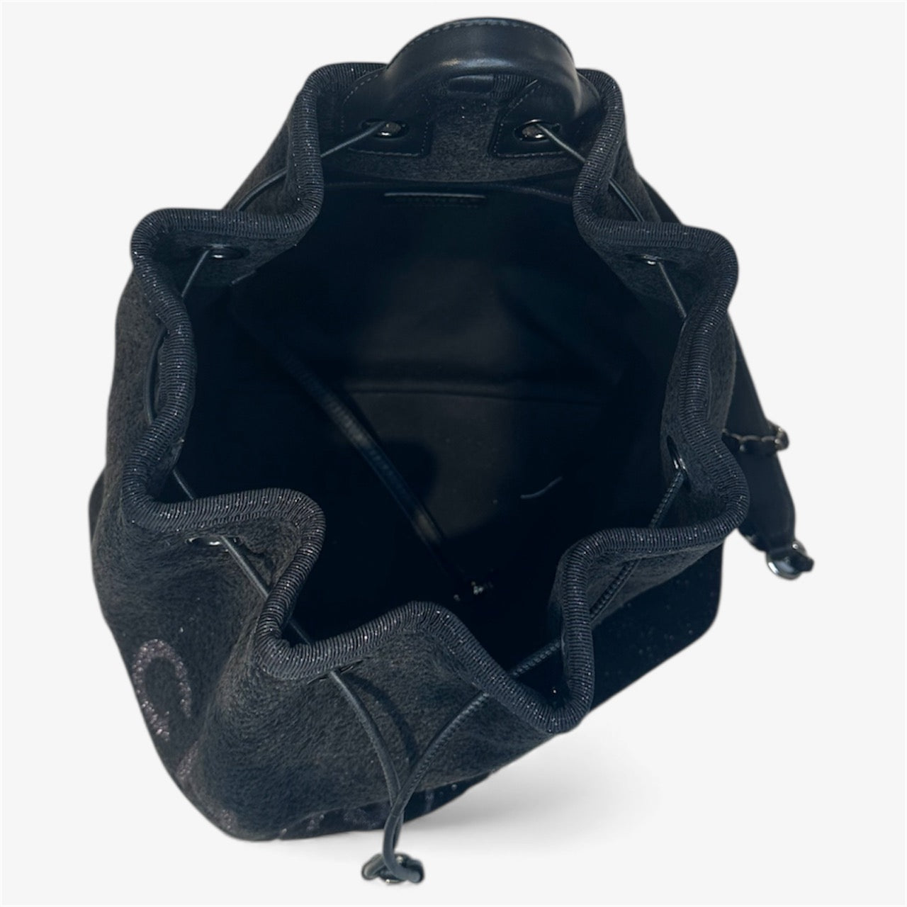 Description: In good condition, pull tie closure, silver hardware, lightly sparkly, and leather straps.