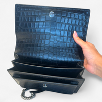 Description: New, black croc design, brushed silver hardware, adjustable chain strap for crossbody or shoulder wear, comes with YSL charm tag, magnetic button closure, multiple built-in compartments inside the bag.