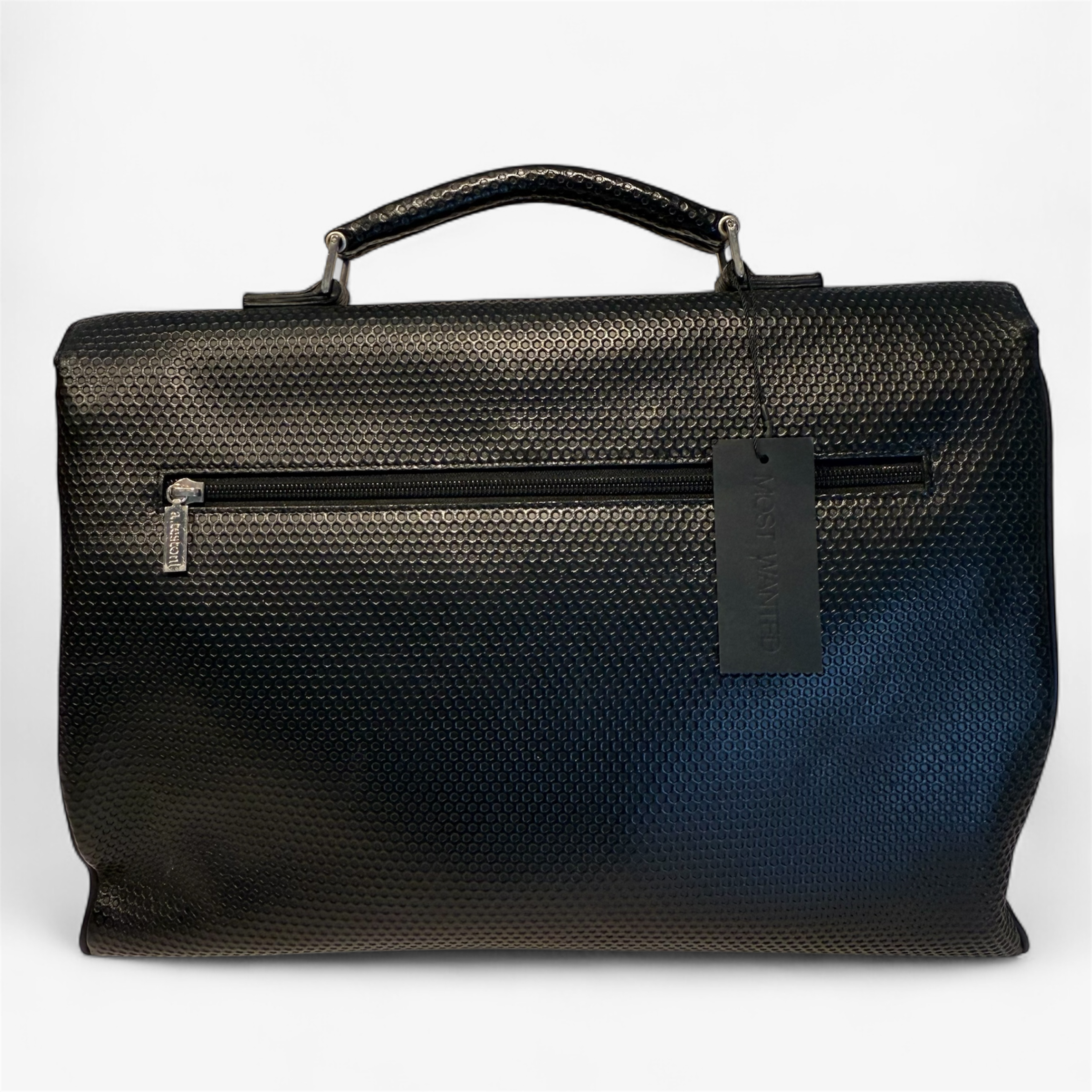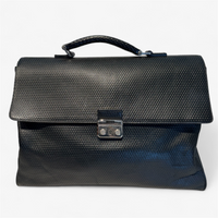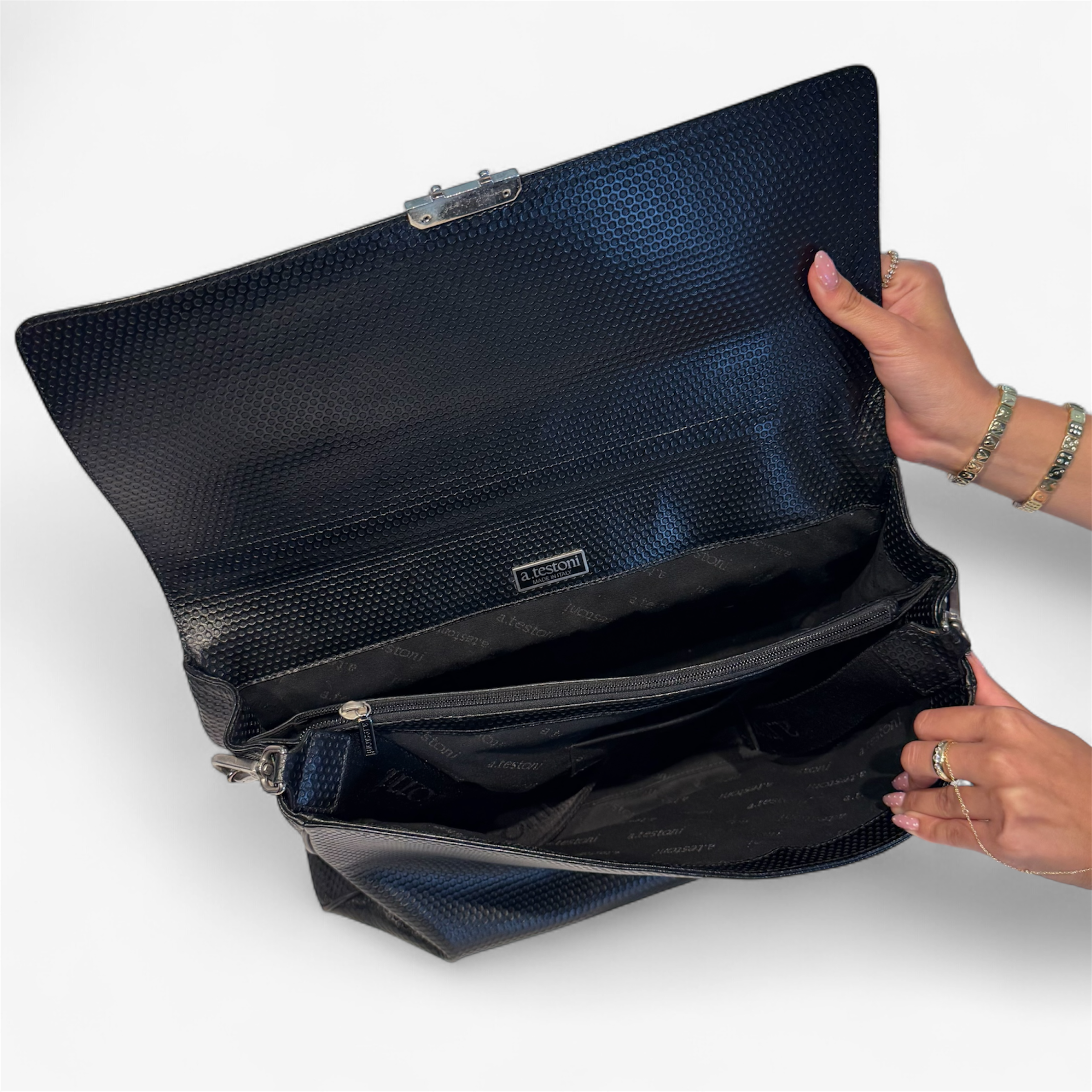 Description : Black leather, silver hardware, clasp closure, comes with shoulder/ crossbody strap. Good condition, some visible wear on hardware.