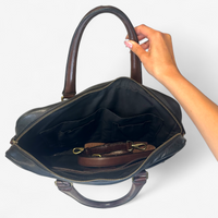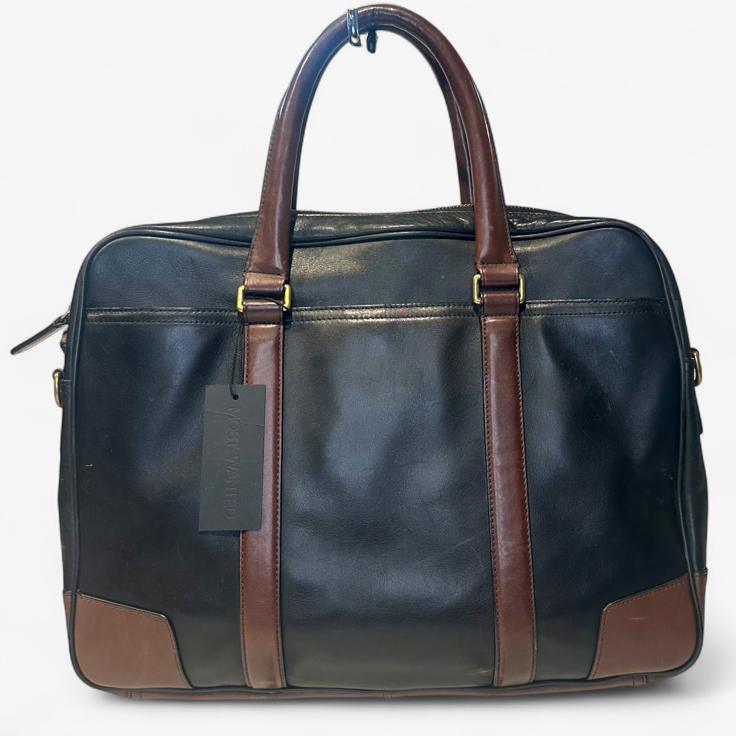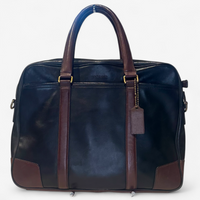 Description: Black and Brown Leather Briefcase, comes with a leather Coach Tag, multiple compartments, a handle and a shoulder strap for easy carrying, good condition, minor wear and tear and scuffs.