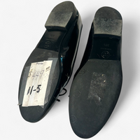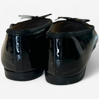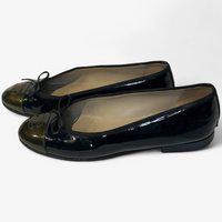 Description: In good condition, featuring classic CC on the toes with bow detailing, and a patent leather finish in olive metallic colour on the toes.