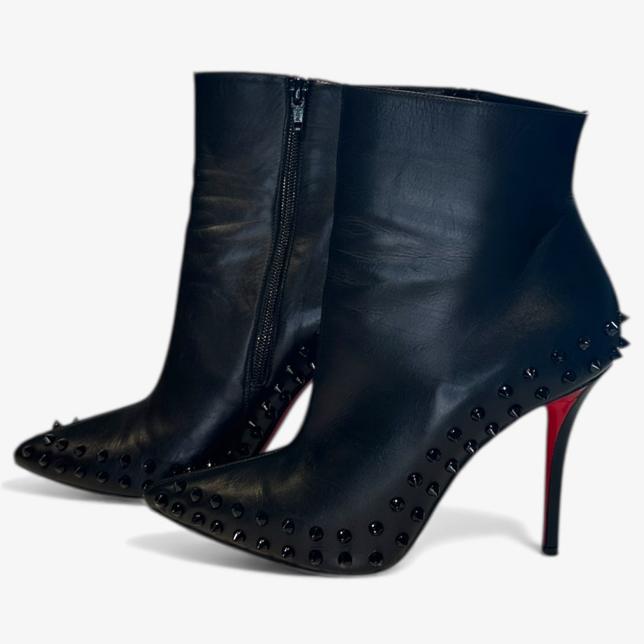 Description: With Box like New, black shiny studding, pointed toe, zipper closure.