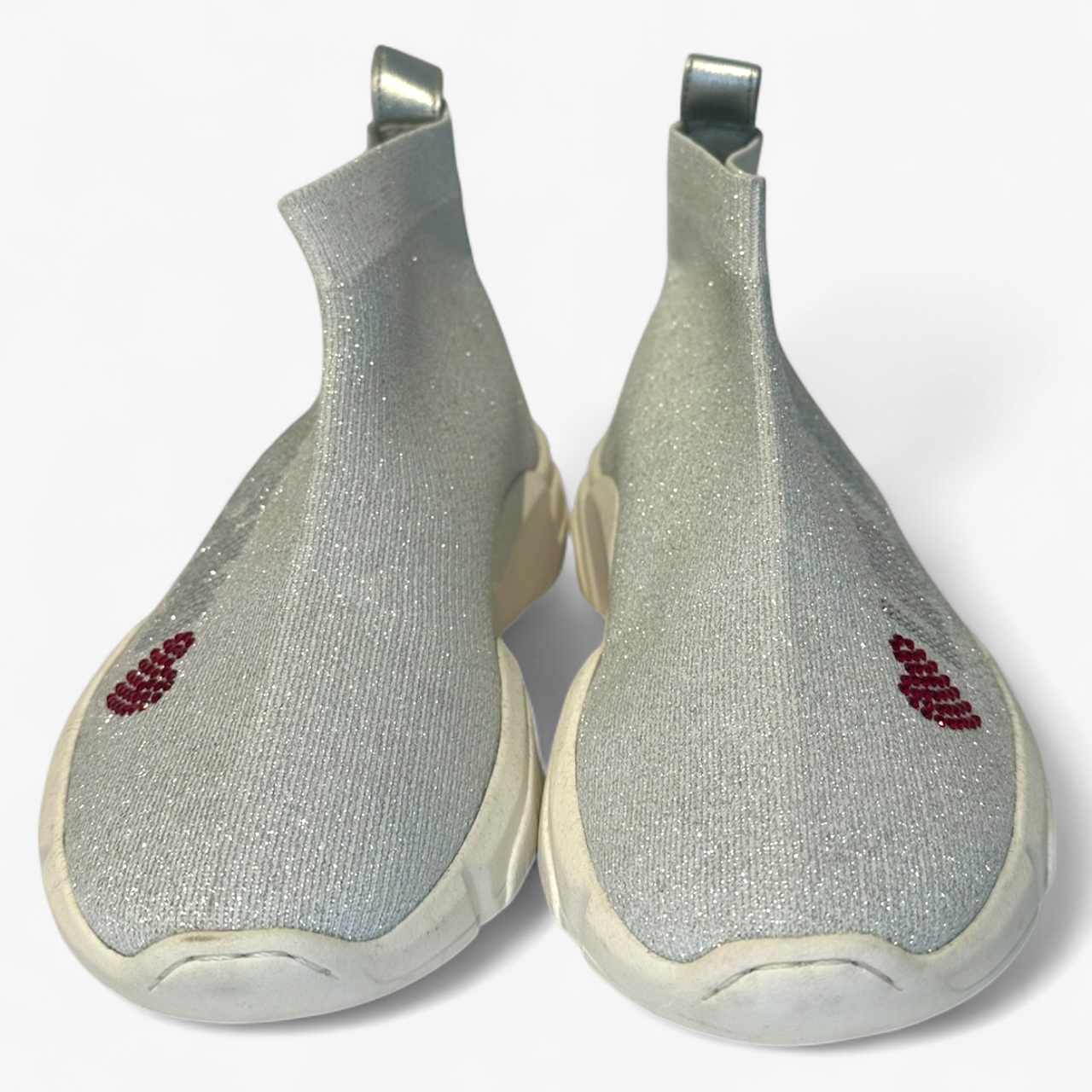 Description: Red Heart in rhinestone. Brand New with Box, featuring sparkle silver material and sliver back detailing.