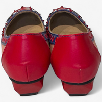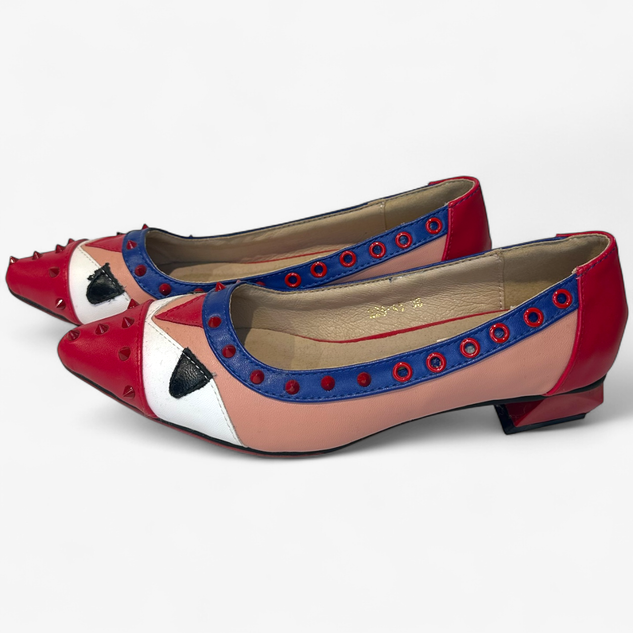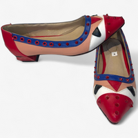 Description: Brand new, red studs and hole design, abstract design, multi colour, asymmetrical heel.
