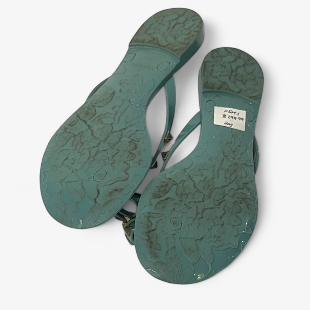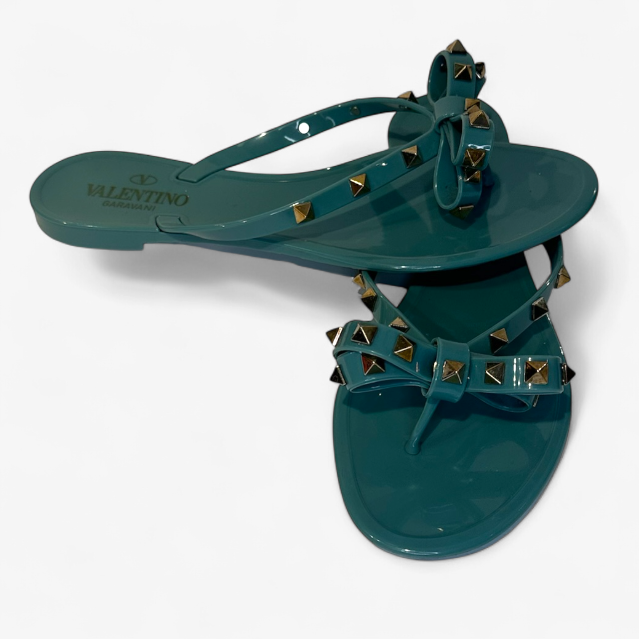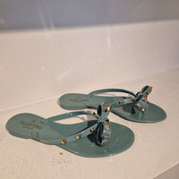 Description: In excellent condition, complete with a dust bag, and showing minor wear on the bottom. Blue-ish turquoise colour, gold hardware.
