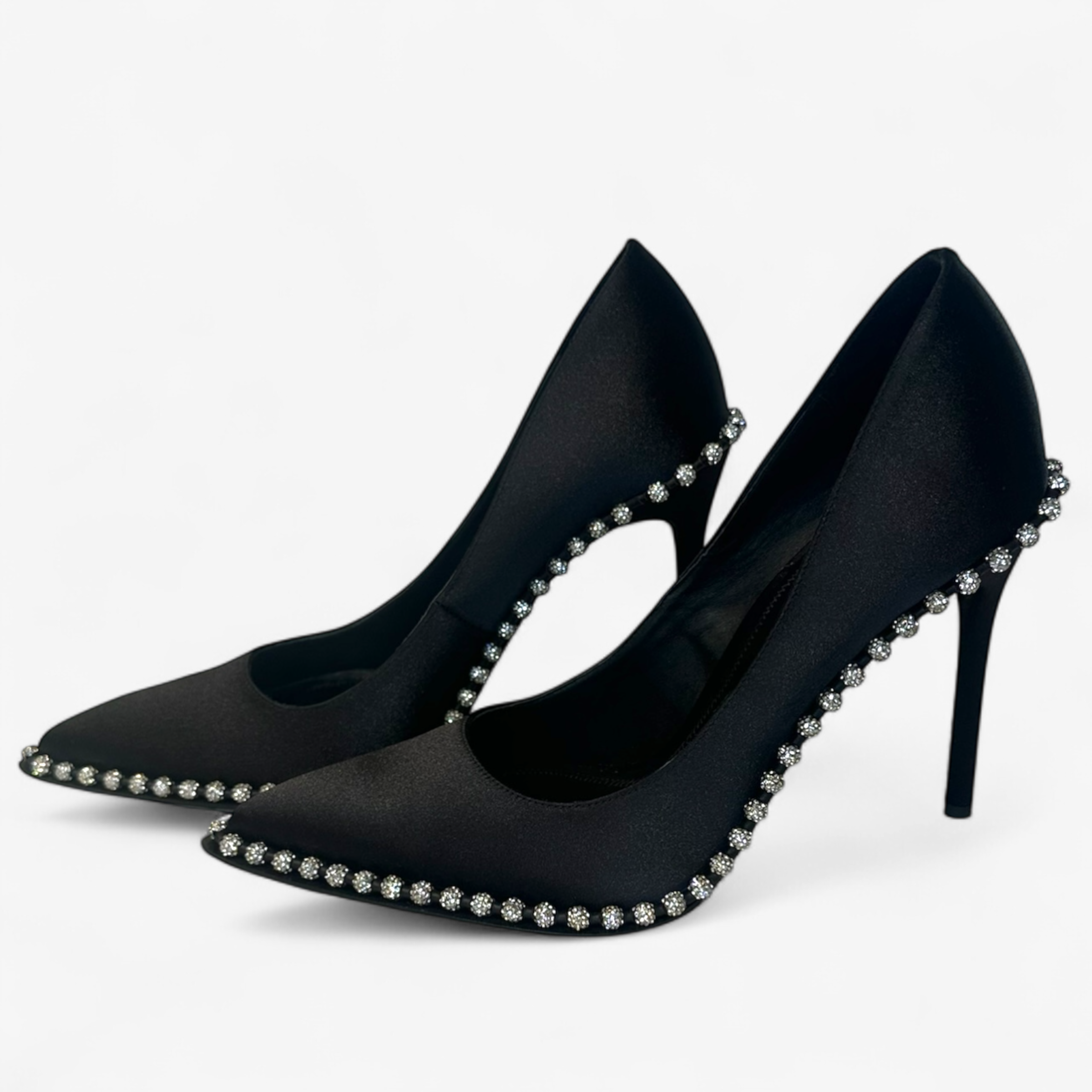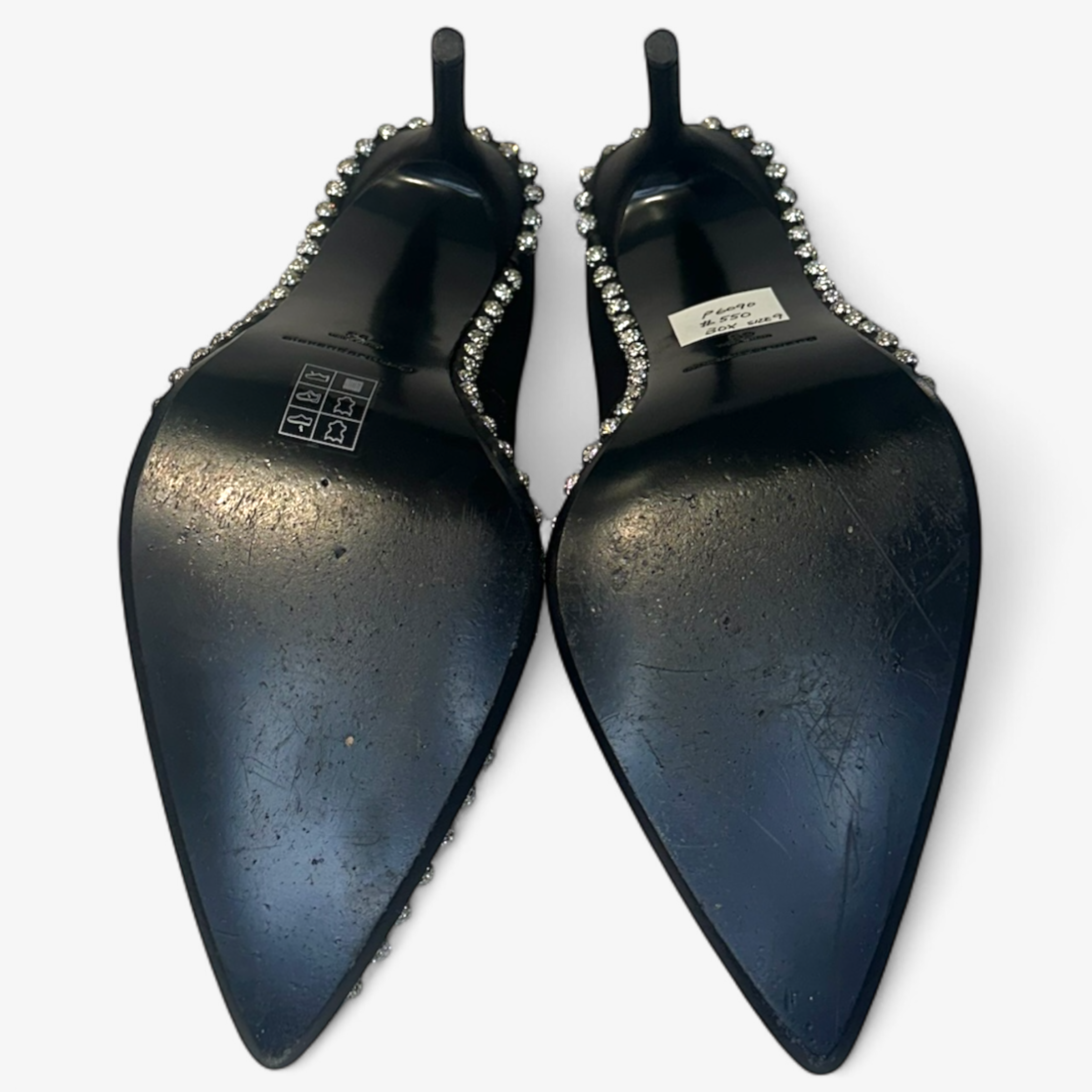 Description: New with Box. Never worn, satin finish with crystal balls around the shoes.