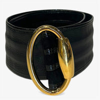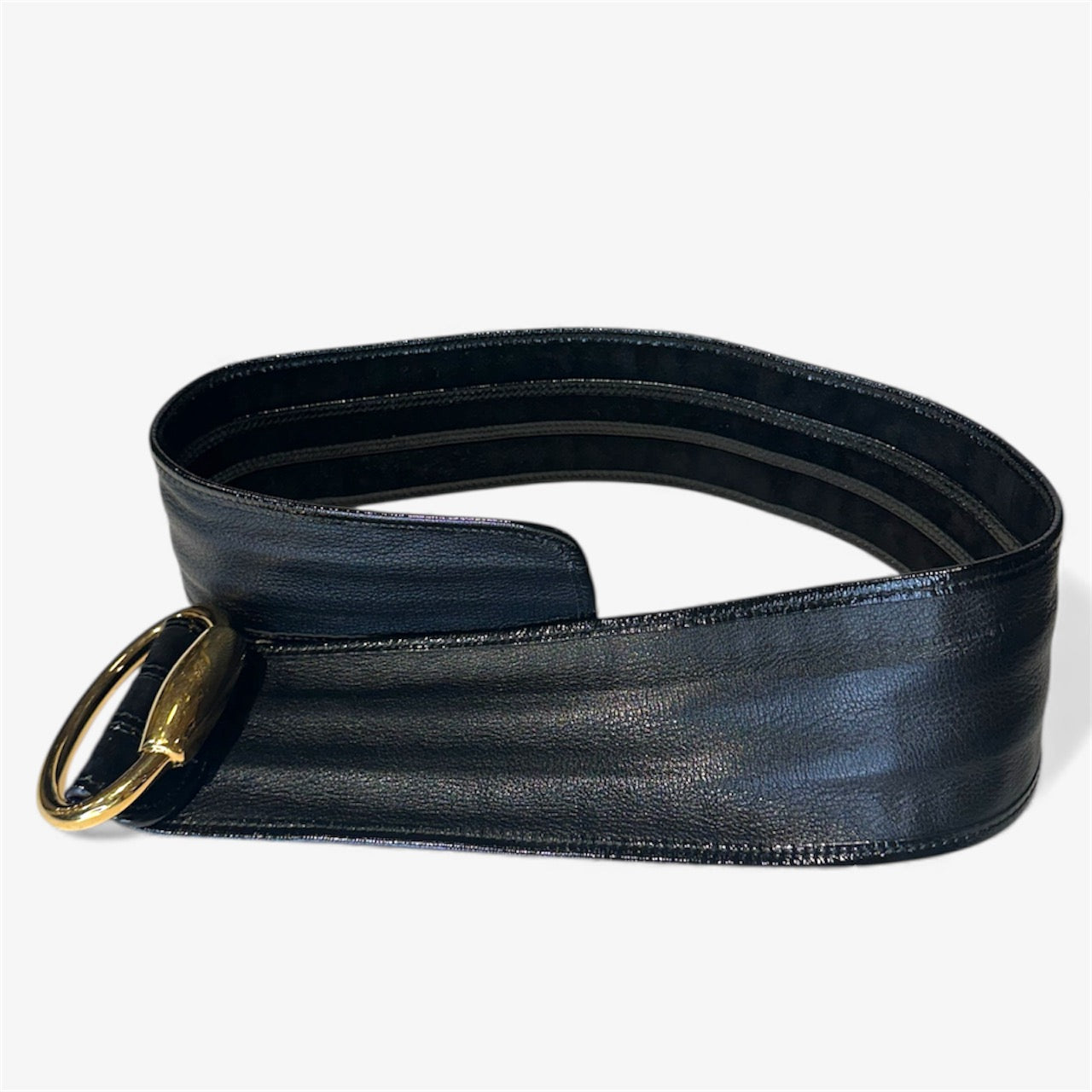 Description: Gucci belt, with gold hardware in good condition, leather and suede detailing.