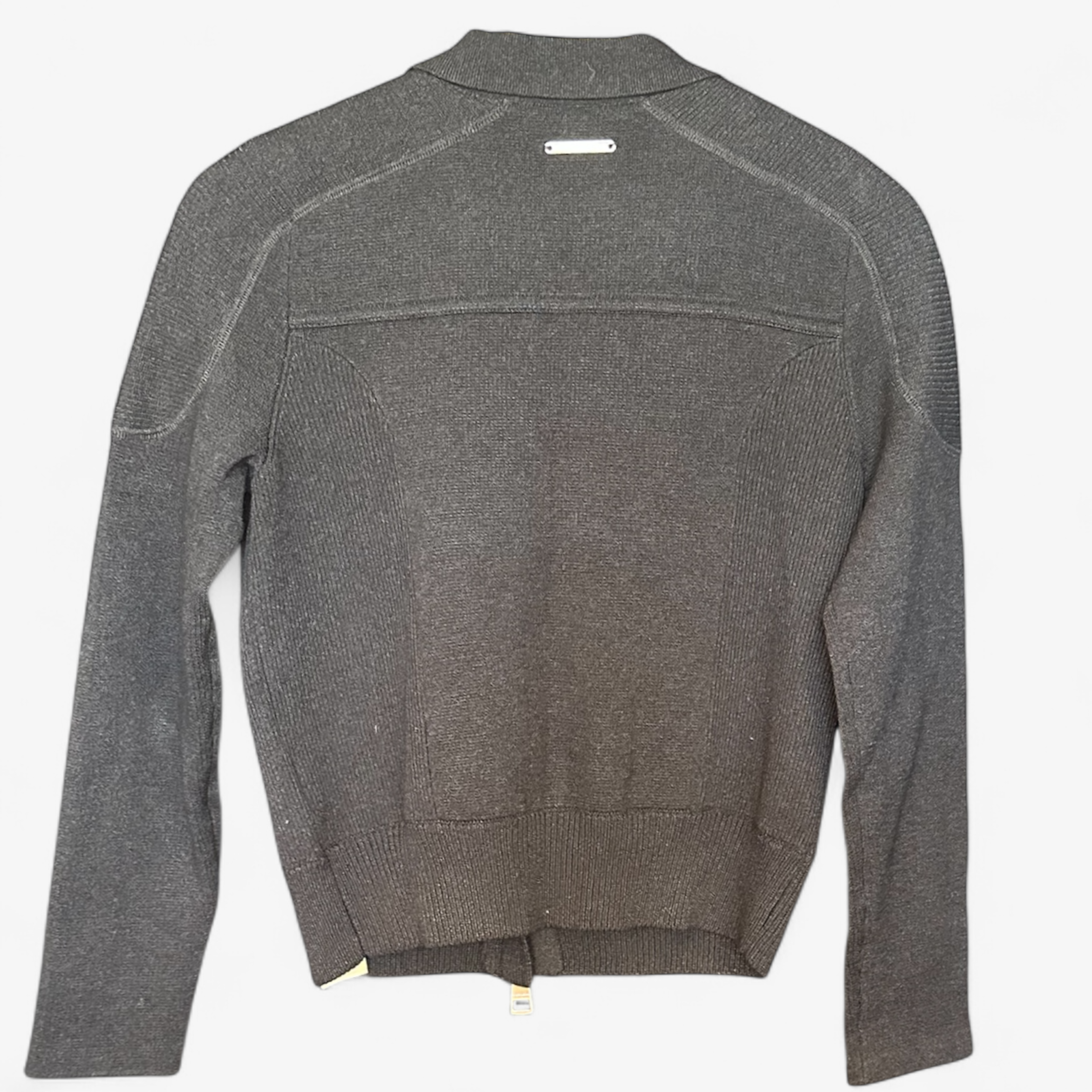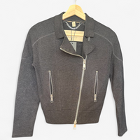 Description: Sweater material, with pockets and silver hardware in good condition.