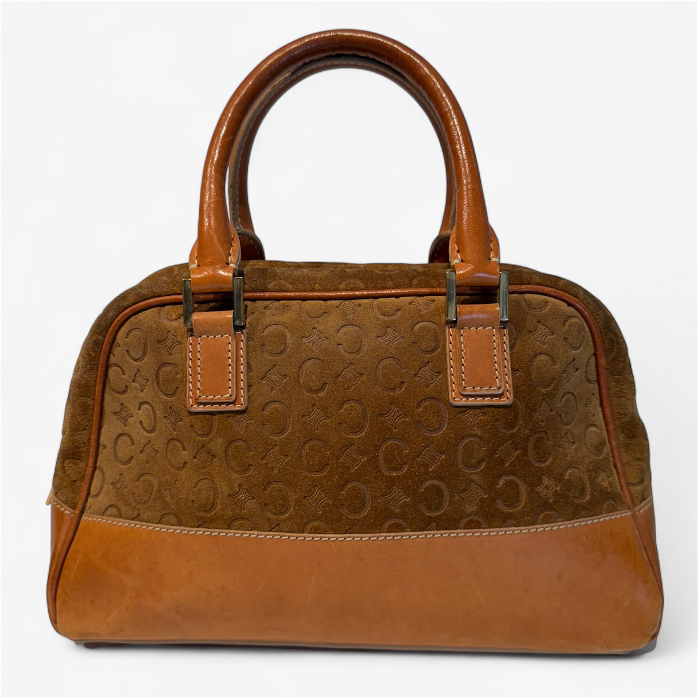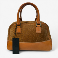 Description: Suede with leather, brown, gold hardware, fair condition, some wear and tear on straps.