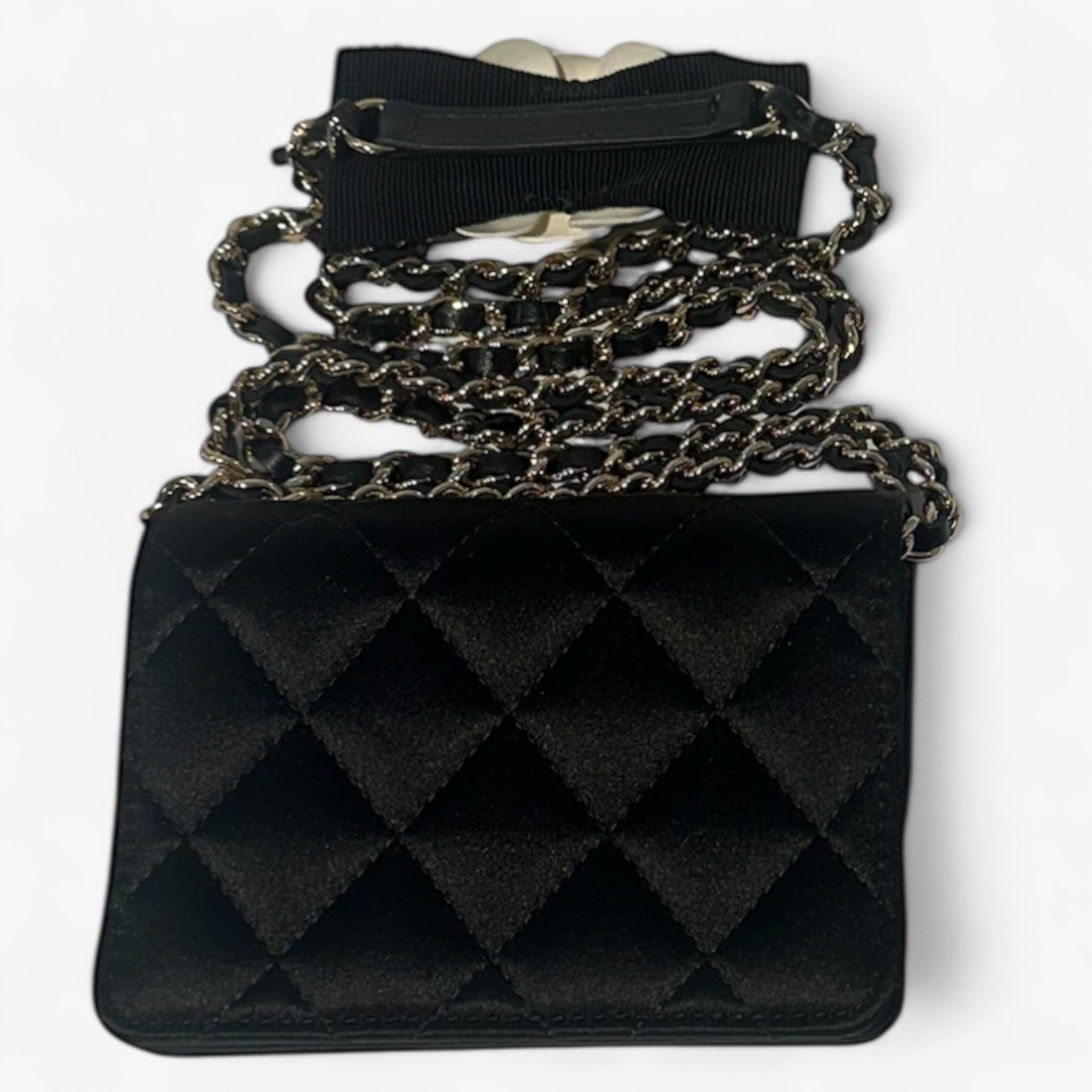 Description: New with Box, satin finish, gold hardware, flower and bow detailing.