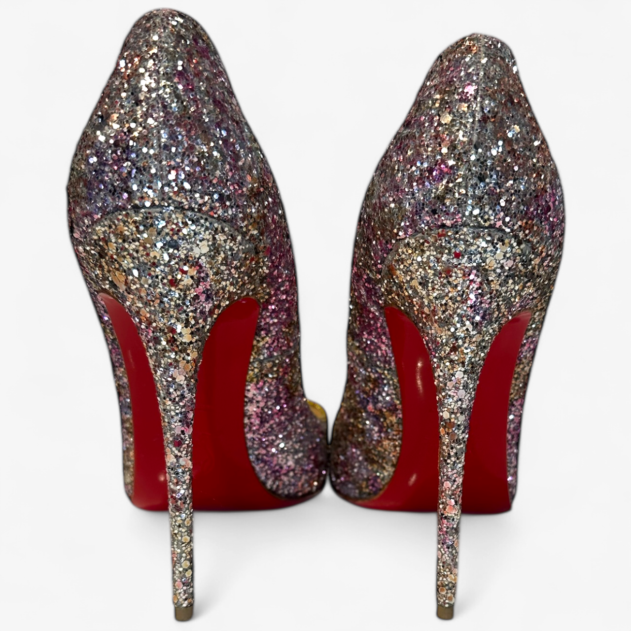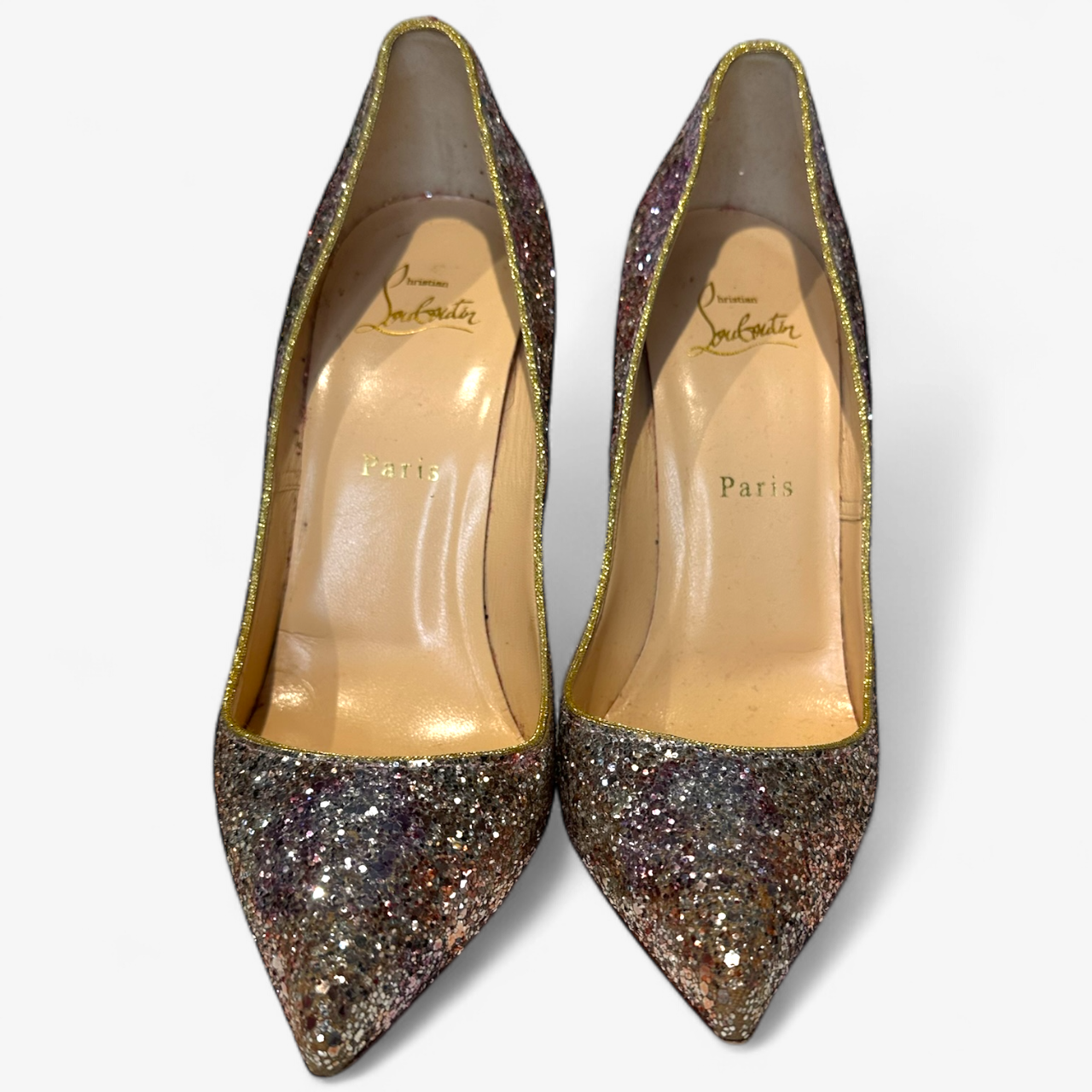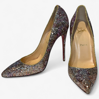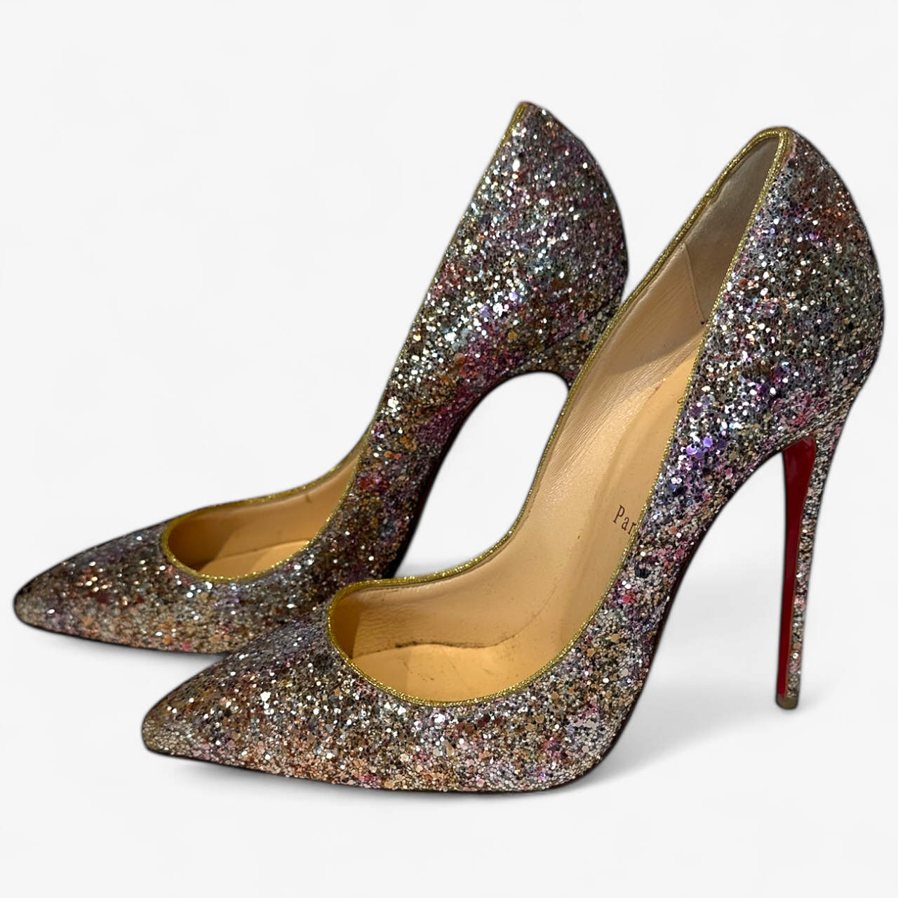 Description: With a box, in good condition, pointed toe, multicoloured glitter.