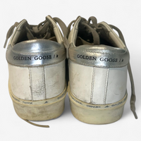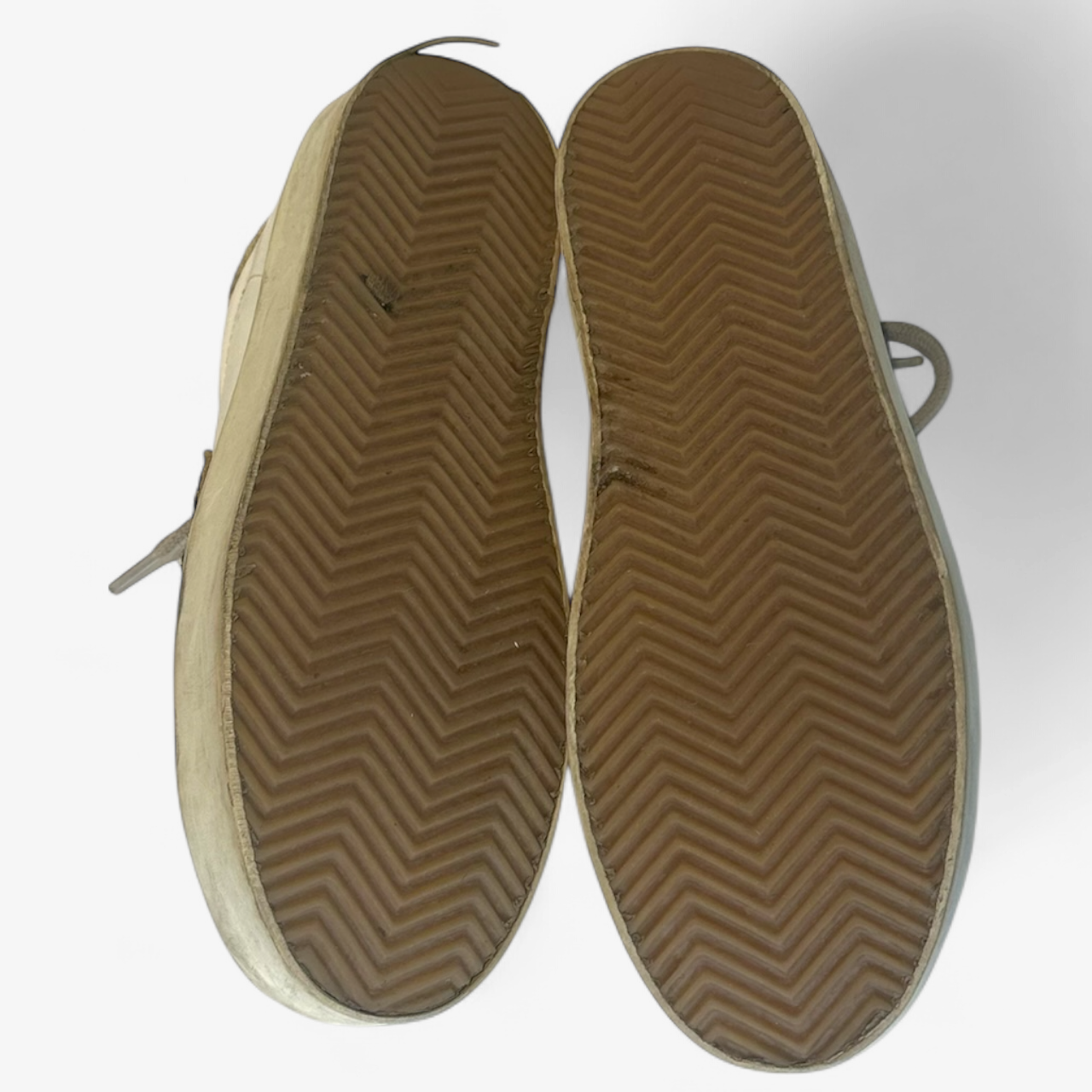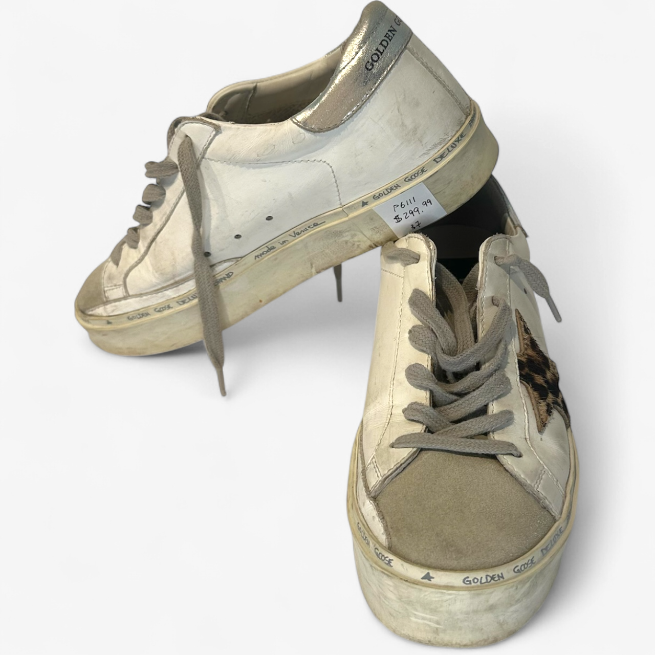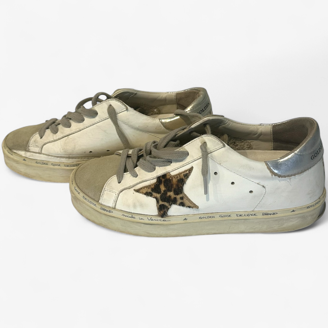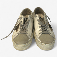 Description : Shows wear on the left heel, with slight hair on the leopard star. Features a worn-in design with a silver back and suede front.