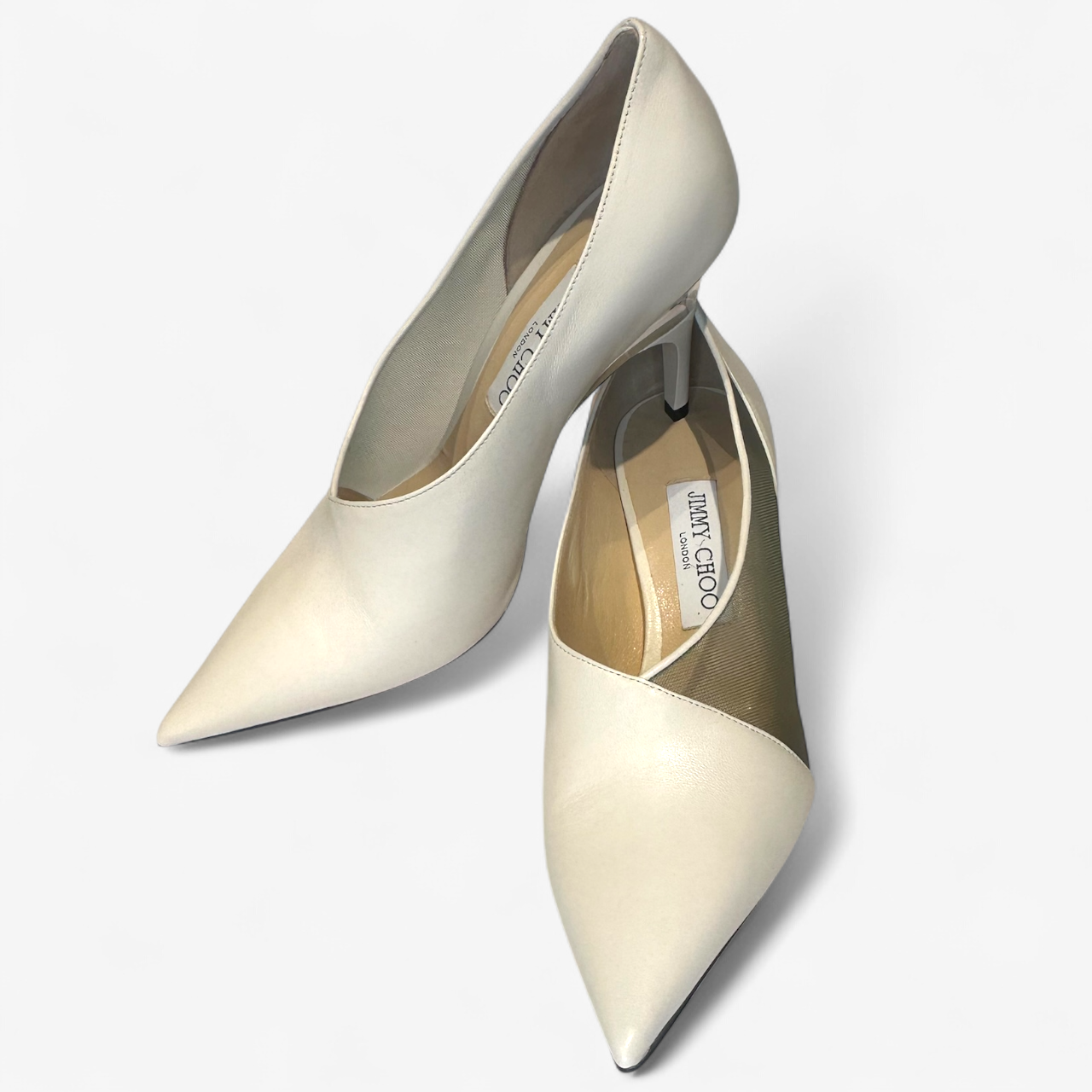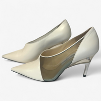 Description: New with box, white leather heels, with clear detailing and mesh sides.