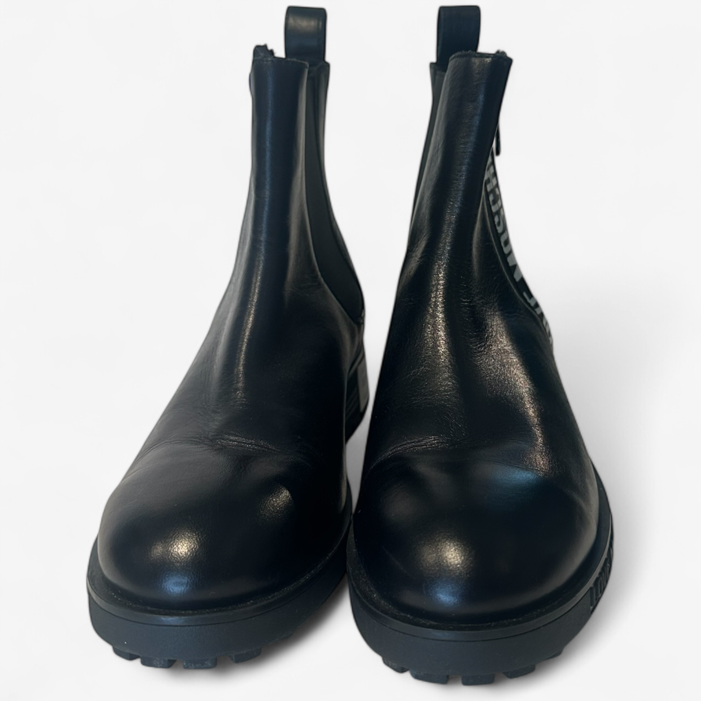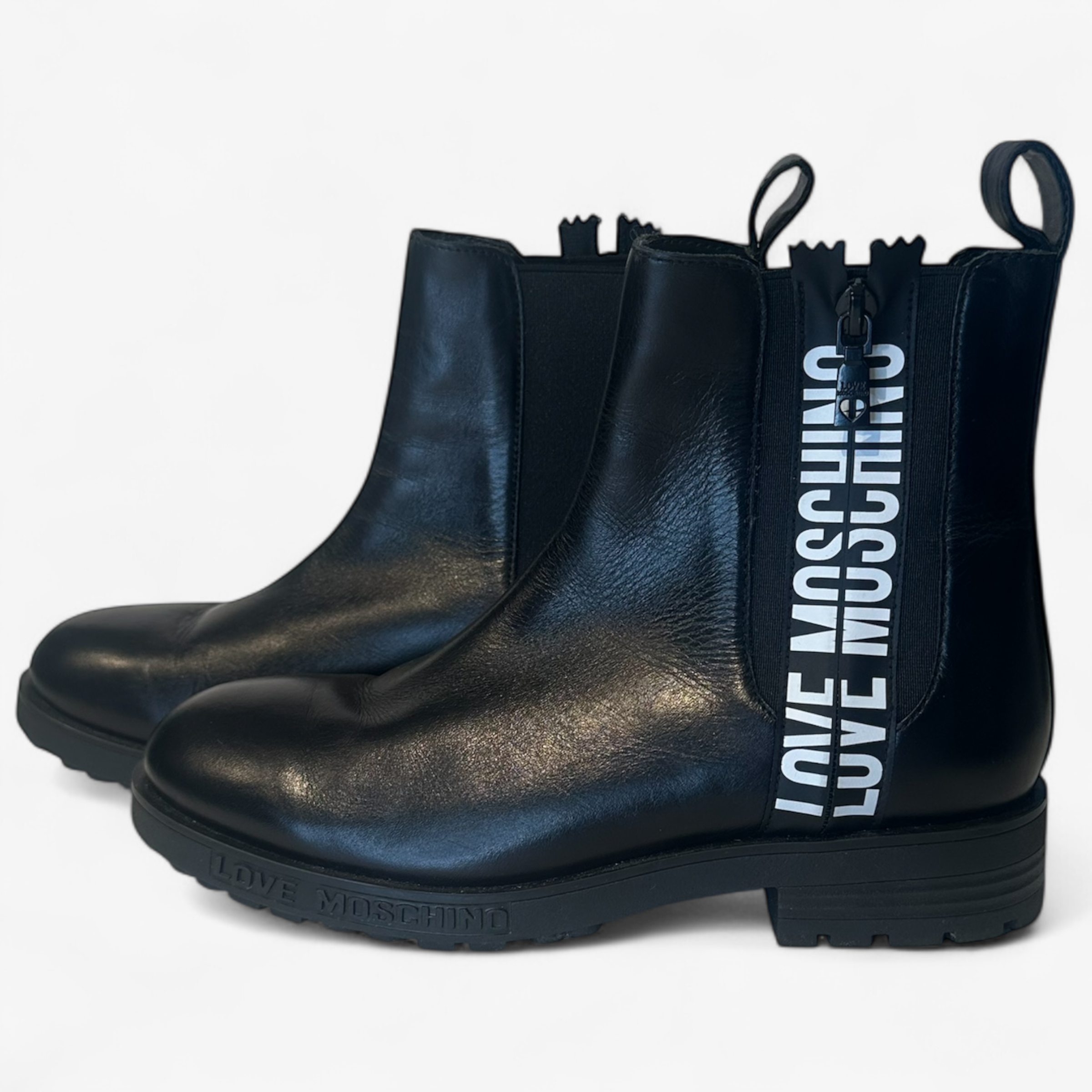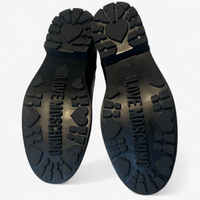 Description: In excellent condition, leather booths with zipper closure and heart detailing on the zipper.