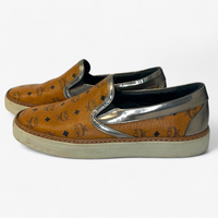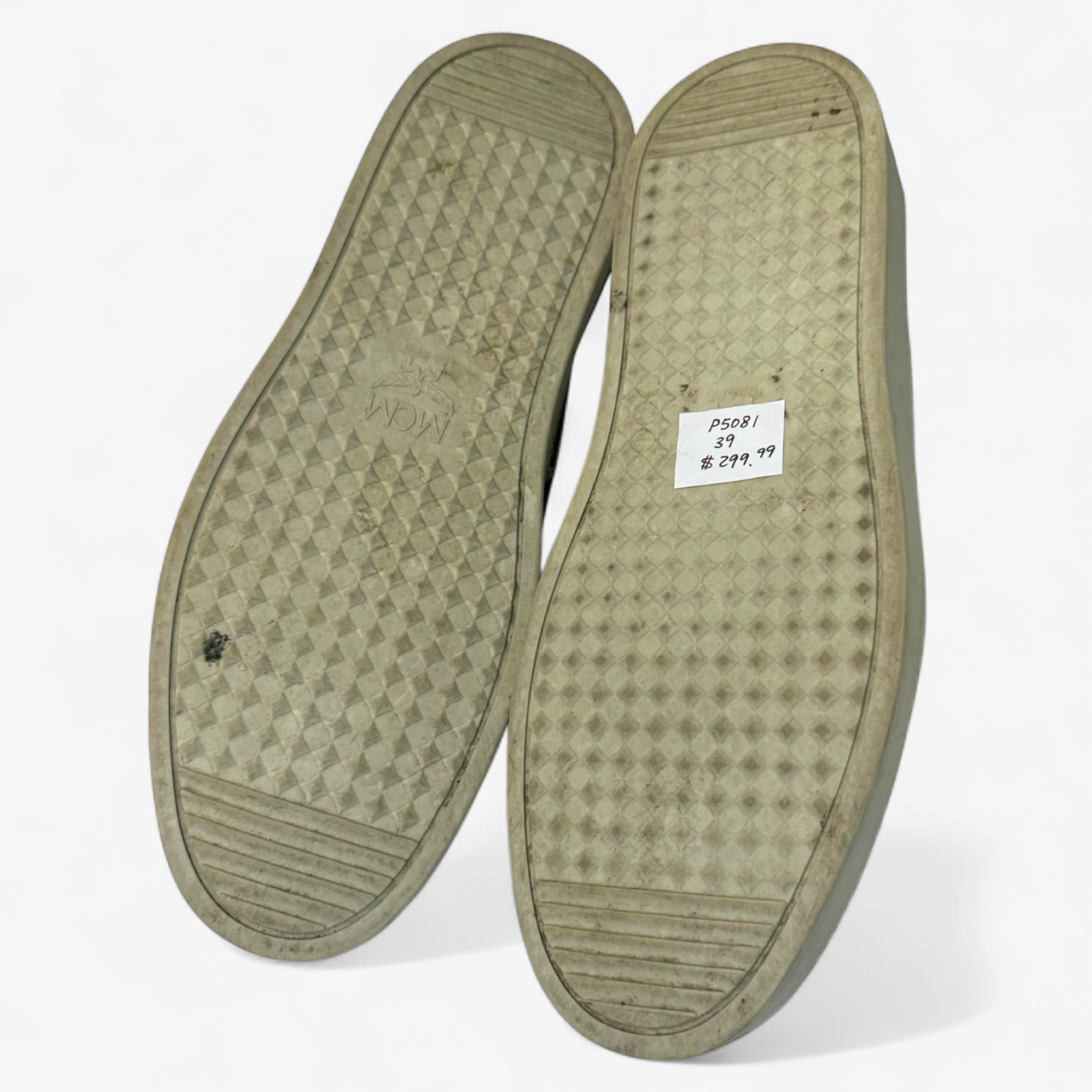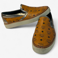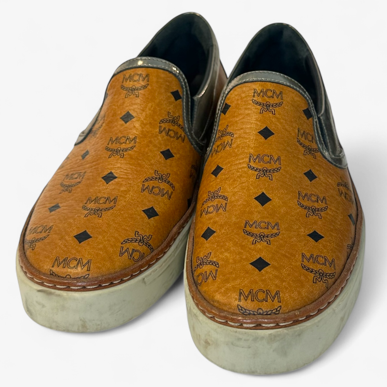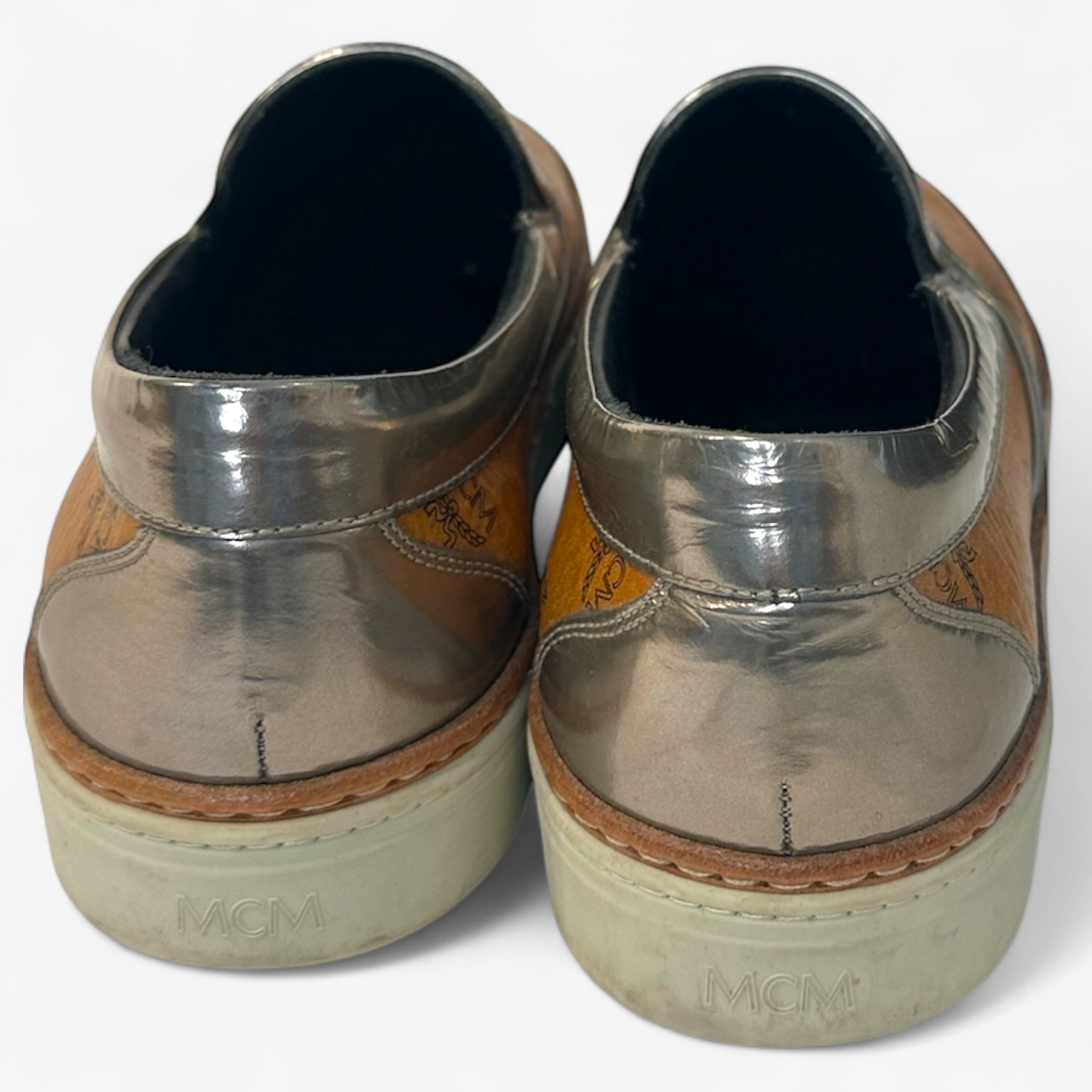 Description: Good to fair condition. classic MCM monogram, metallic detailing, Vans style.