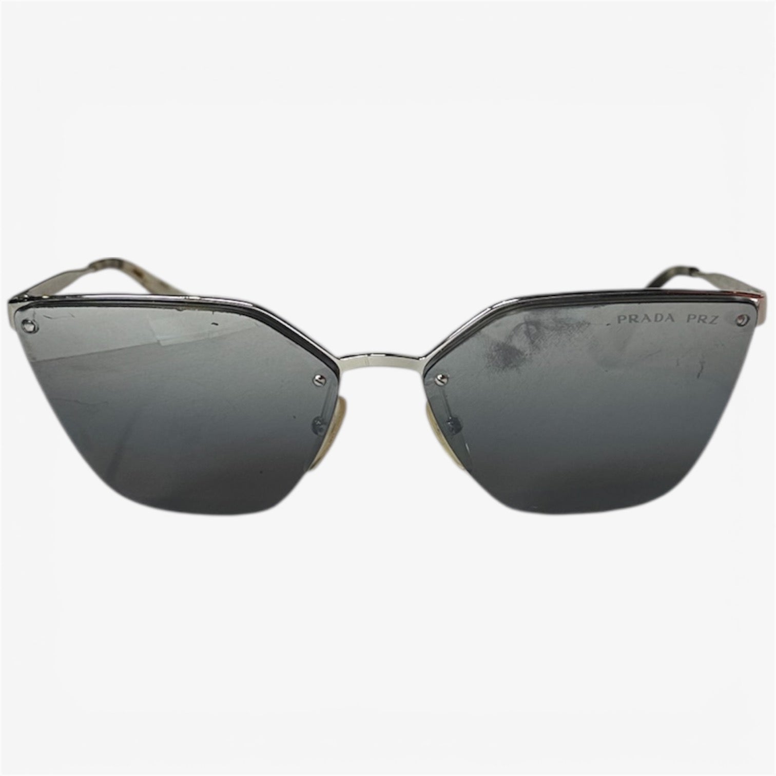 These Prada 68TS sunglasses feature a sleek silver-tone frame paired with grey lenses, offering a modern and versatile silhouette. The minimalist design makes them an easy addition to both everyday and elevated looks.