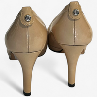 Description: In good to fair condition, patent leather, beige heels with silver hardware.