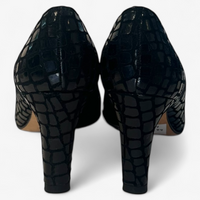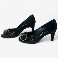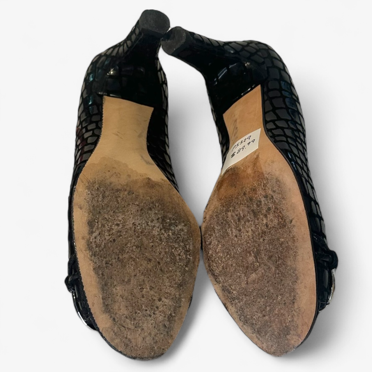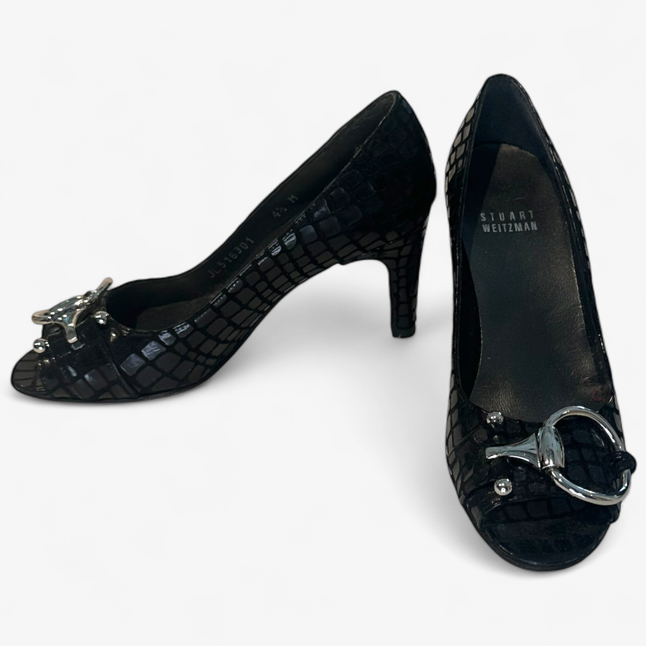 Description: Silver hardware in good condition, featuring a snake skin print and an open toe.