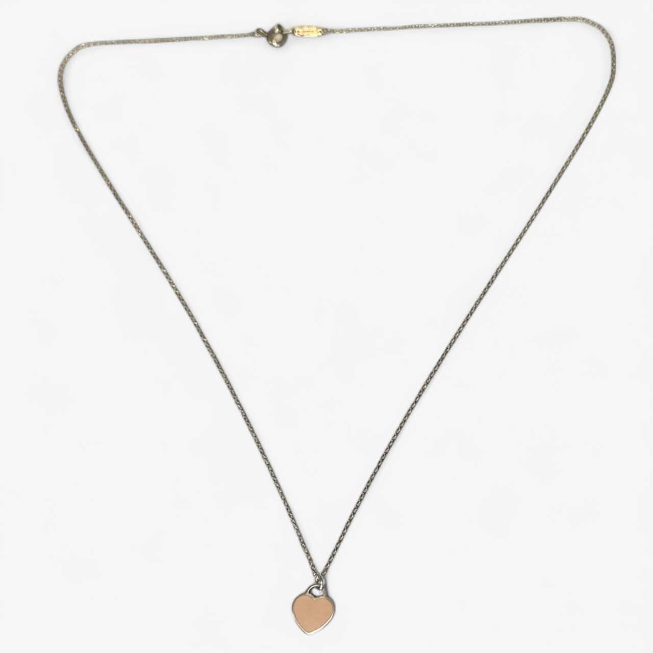 Description: Pink on one side, silver on the other, in good condition, classic Tiffany necklace.