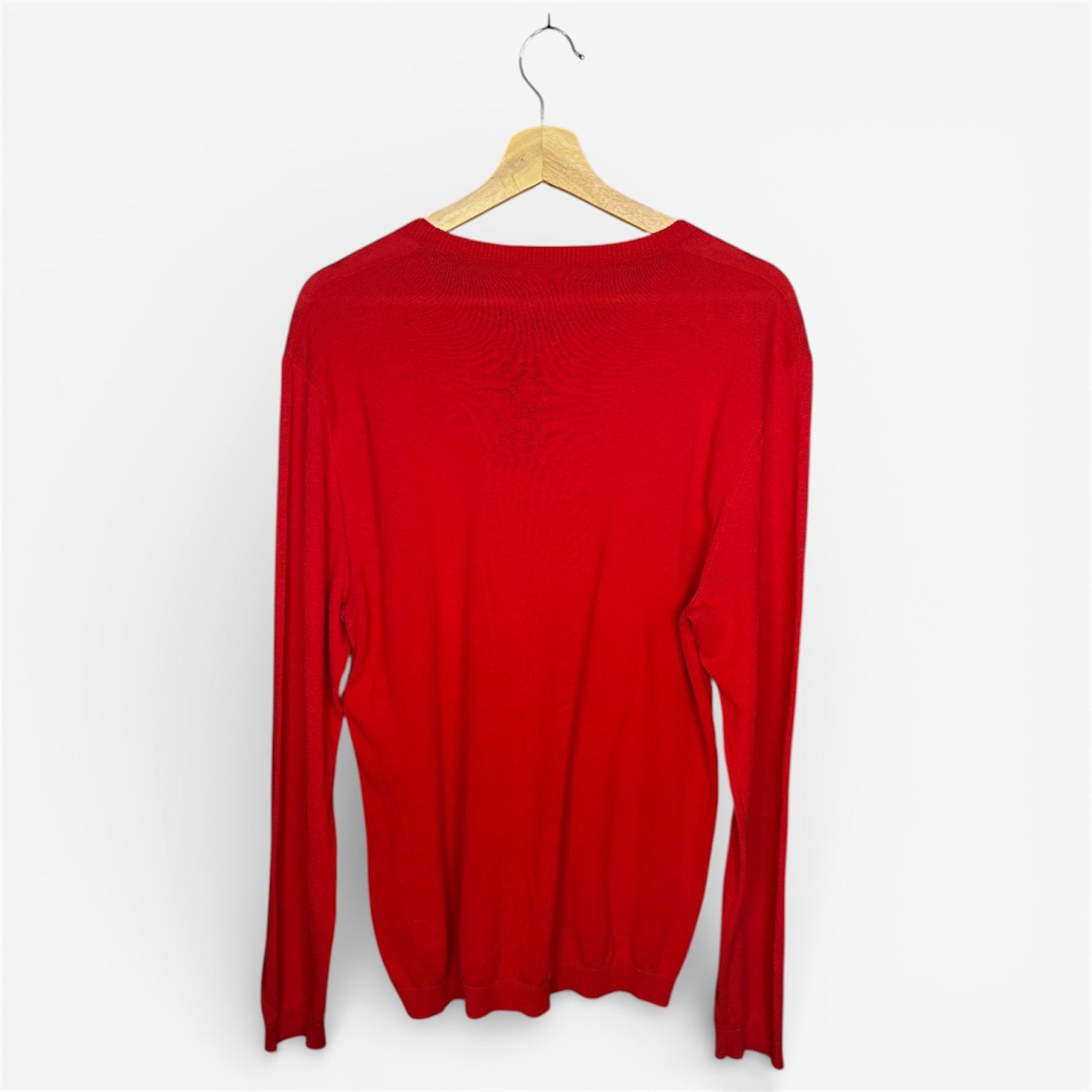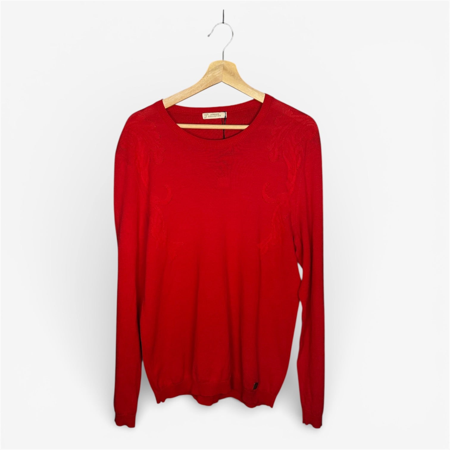 This Versace men’s red sweater features a bold yet refined design, finished with a classic Versace pattern along the shoulder and extending slightly down the side. The detailing adds a signature touch while keeping the overall look wearable and timeless.