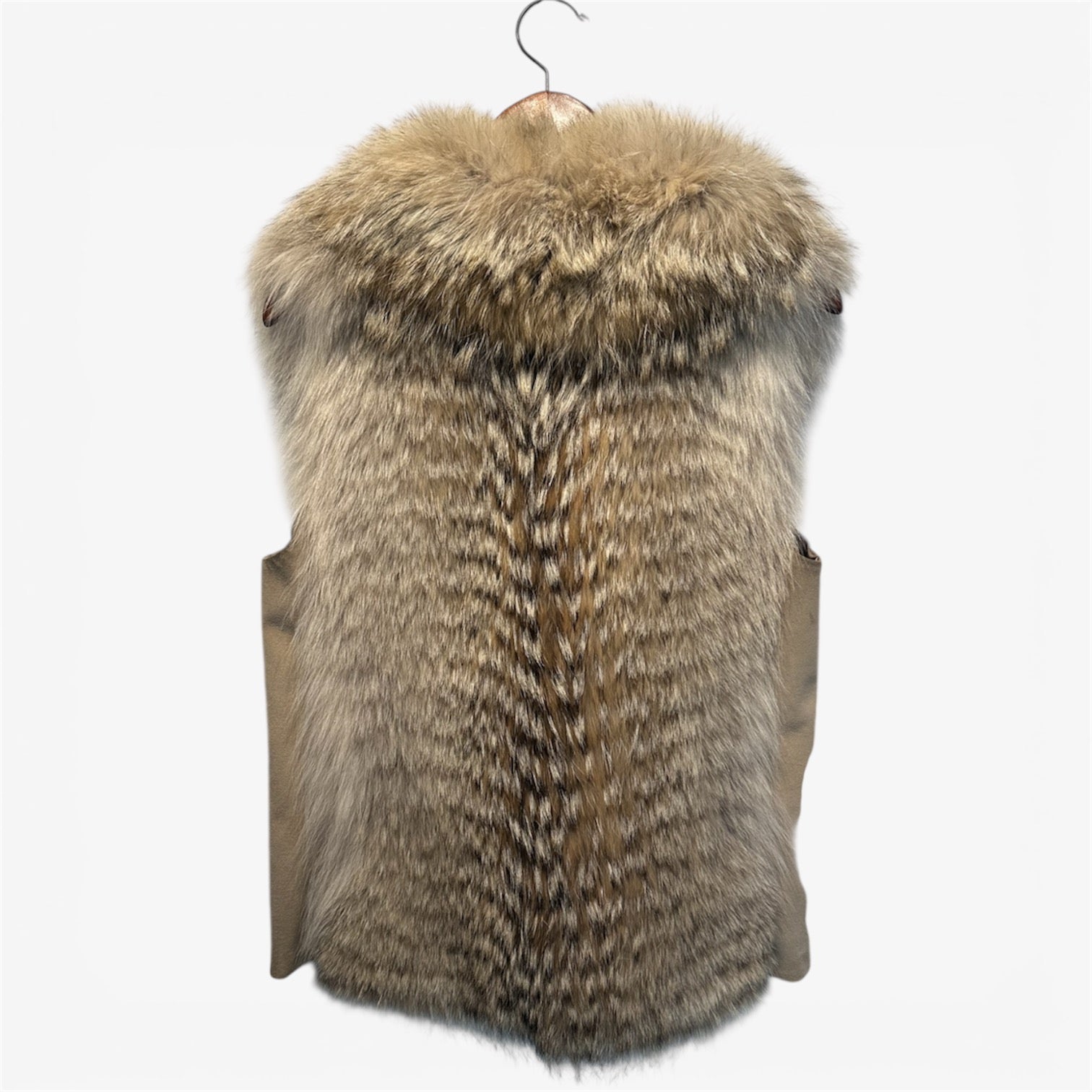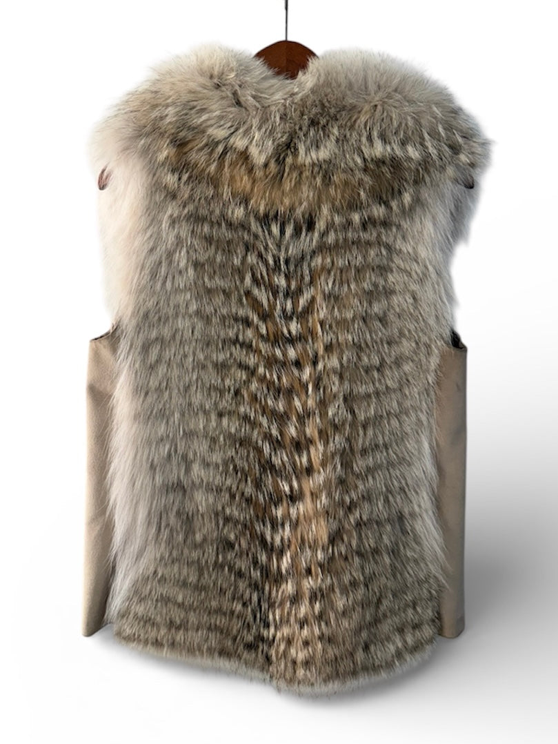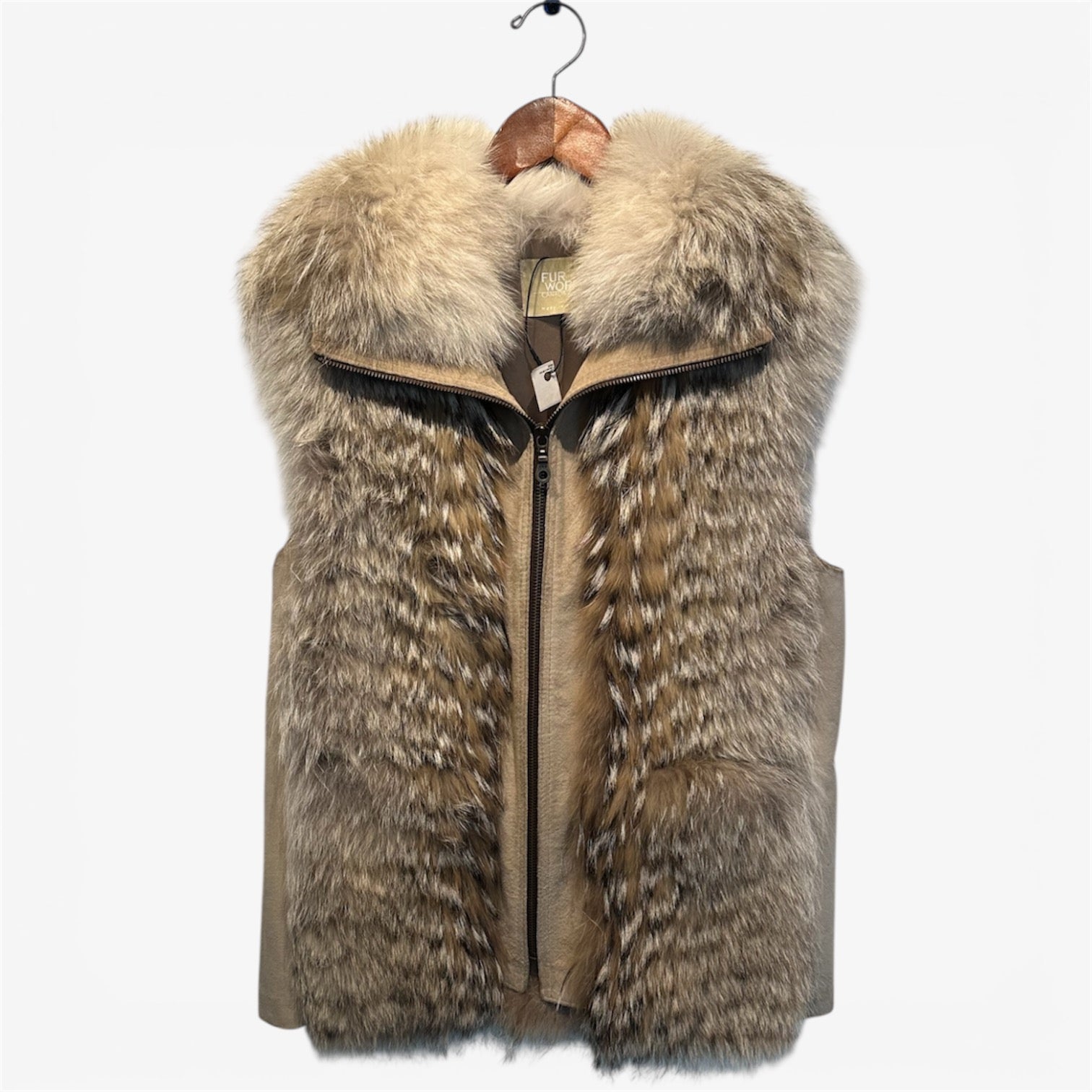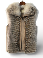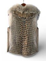 This white fur vest is accented with suede detailing, offering a soft textural contrast and an elevated, winter-ready look. Designed to layer effortlessly over knits or long sleeves, it adds warmth and dimension without bulk.